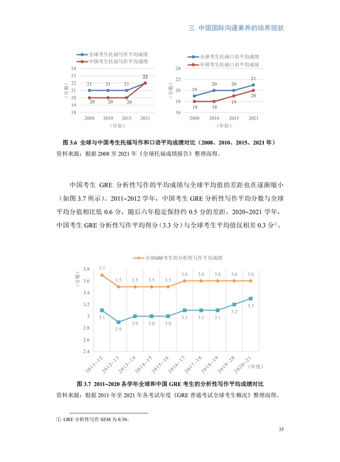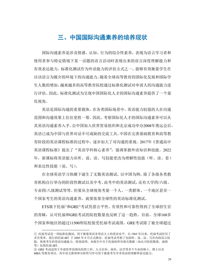 2. 以外语知识与技能为代表的国际沟通素养培养取得较为丰富的成绩。目前国际沟通素养培养已贯穿初、中、高等教育及职业教育体系全过程,并从英语教育领域拓展融入不同的学科教育领域。基础教育阶段,国际学校不断发展,截至2020年10月,全国正常运营、采用国际课程、实行双语教学的各类全日制国际学校共计1399所。越来越多高校创造国际化校园环境,提升国际化水平,2023年QS世界大学排名前100的中国大陆高校中,国际学生占比为5.4%~17.5%、国际教师比例为6%~47%。自2009年起,中国已成为全球托福考生人数最多的国家。从ETS每年发布的《全球托福考生成绩报告》来看,过去十余年,中国考生的托福考试成绩显著提升,平均成绩由2010年的77分提高到2021年的87分,逐步接近全球考生的平均分(88分);托福成绩100分以上的考生人数占全球考生人数的比例较2009年增长了三倍。