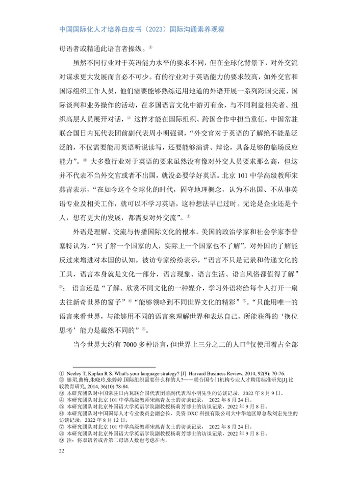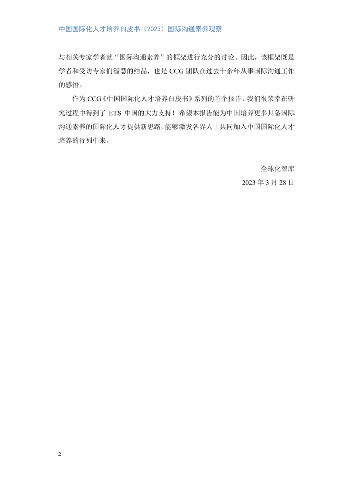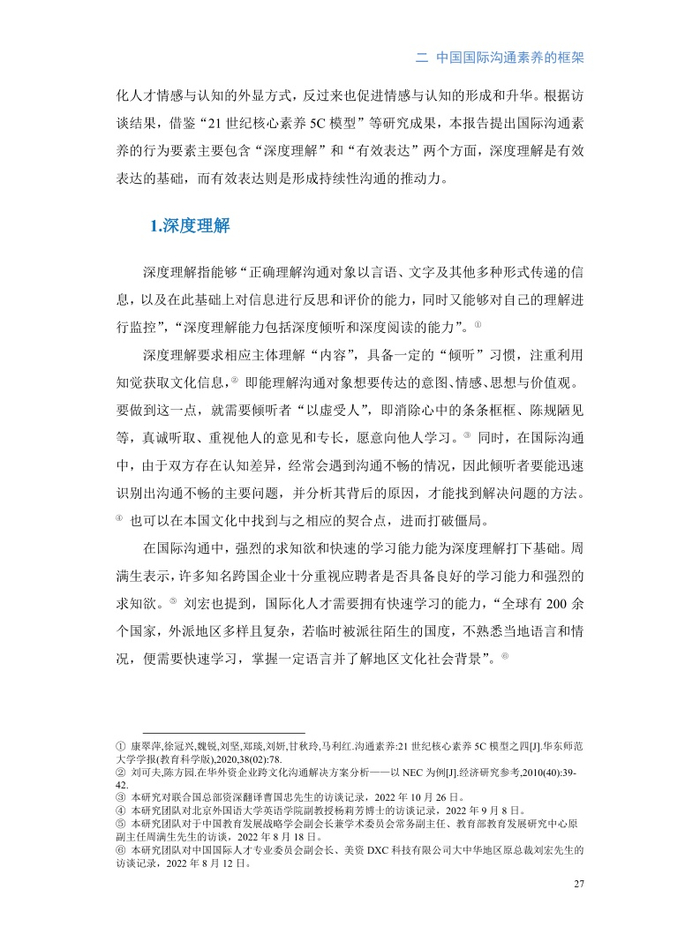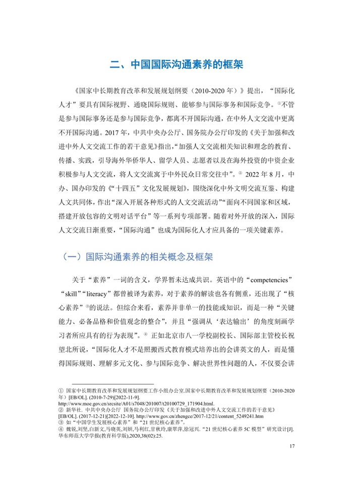 1、本报告基于调查研究分析,构建了国际化人才的国际沟通素养框架,包括情感内核、认知基础、行为要素三个层次。情感内核是国际沟通素养的基础与前提,包括国家认同、全球关怀两个重要元素。认知基础是连接情感内核和行为要素的桥梁,包括外语知识与技能、世界知识与全球议题、专业知识与技能,以及信息技术知识与技能。行为要素是情感内核和认知基础的外显方式,可促进情感内核和认知基础的形成,包括深度理解和有效表达两种形式。