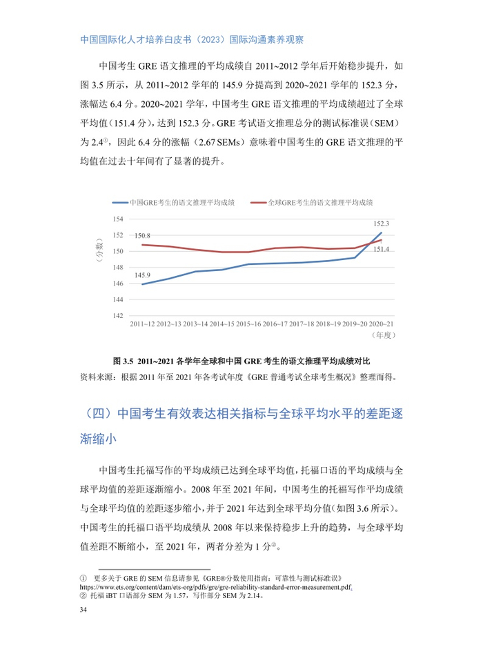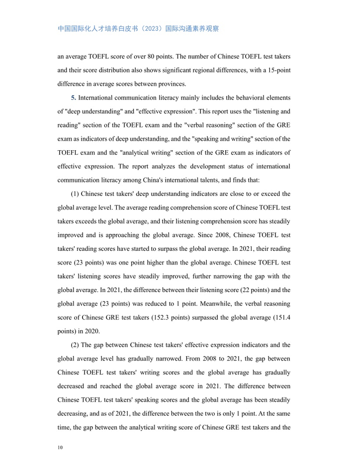 5. 国际沟通素养主要包括“深度理解”和“有效表达”两方面的行为要素,本报告以托福考试的“听力+阅读”以及GRE考试的“语文推理”作为深度理解水平的衡量指标,以托福考试的“口语+写作”以及GRE考试的“分析性写作”为有效表达的衡量指标,分析中国国际化人才国际沟通素养的发展状况,并发现: