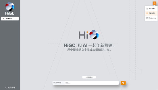 作为一个营销创意协作工具,HiGC实现了多源一站式整合,不但接入了ChatGPT-4,更整合了Midjourney V5,同步实施以Stable Diffusion为基础的开源创图模型的私有化部署,全面整合优化了AIGC工作流,全面满足客户全链路、全场景、全工作流的概念研发、数据挖掘、策略发想、方案策划,内容营销、图文创意、设计协作、代码编程乃至视频制作的全流程需求。