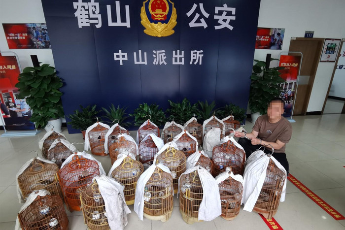 4月6日,鹤山市公安局治安大队联合鹤山市林业局、中山派出所、沙坪街道森林平安义警到该居民住宅家中依法搜查,现场抓获一名涉嫌危害珍贵、濒危野生动物嫌疑人吴某(男,39岁),查获国家二级野生保护动物画眉鸟13只,国家三有保护野生动物鹊鸲鸟15只和柳莺鸟1只。