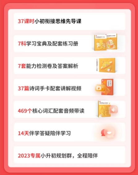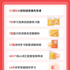 乐读的先导课中还包含了“六大秘籍”“带读音频”和“诗词讲解视频”。六大秘籍是指七门学科的学习宝典、练习题、能力检测卷,还有错题本、核心词汇手册和古诗词手卡。这些资料能及时帮孩子在小初学习环节查缺补漏,系统地巩固知识,打好学习地基;带读音频与核心词汇手册是配套使用的,通过英语词汇的标准带读,带领孩子开口说英语、纠正孩子的不良发音、培养孩子的英语自信;诗词讲解视频与古诗词手卡配套使用,语文老师会深入剖析和细致讲解古诗词内容,加强学生理解,引导学生融情会意。