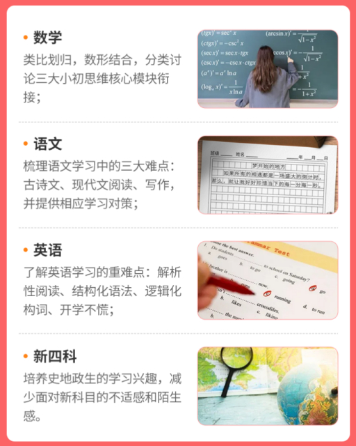 该必修课共有37课时,涵盖了语文、数学、英语、历史、地理、政治和生物这七大学科的内容。由老师深入分析七大科的重难点,为学生提供相应的衔接计划和学习对策。借此逐步引导学生认识新学科、适应多学科学习,为其初中生活“开好头”。