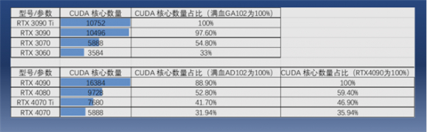 参考上一代RTX 30系列显卡CUDA核心规模我们不难发现,RTX3060其CUDA核心数量大约为RTX 3090 Ti的54.8%,RTX 3060 CUDA核心数量大约为RTX 3090 Ti的33%。也就是说像RTX 4070这样的CUDA核心数量,放在过去的命名方式中也就是“60级别”的显卡,或者应该称作“RTX 4060”。