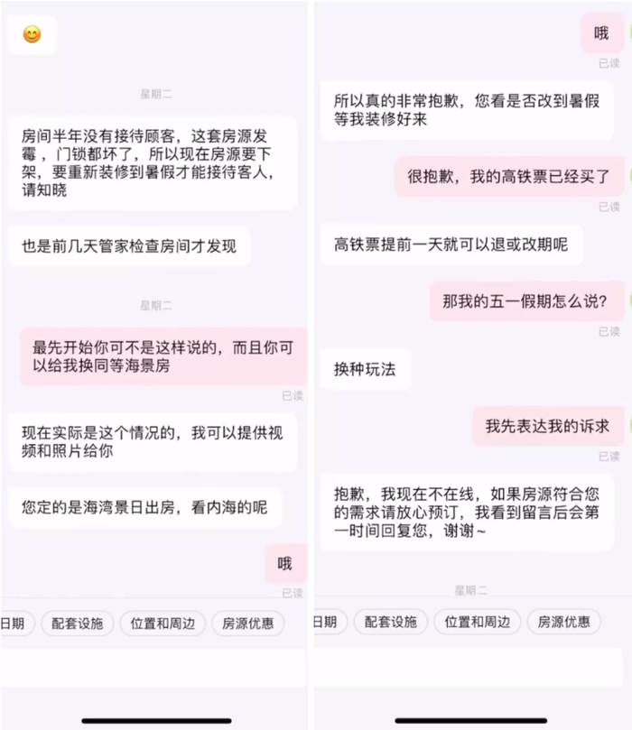 来源 / 受访者提供张雨一行人遇到的老板,更加“简单粗暴”。 她告诉深燃,他们一家和朋友两家,一行9人在2月底就商量好五一假期去威海玩,3月1日,他们通过某OTA平台预订了一栋三层别墅,一天1000多元,三天房费共3781元。起初民宿老板态度热情,4月初,还一直打听着他们有没有买到去威海的高铁票。就在4月20日,民宿老板突然要求他们退房。就在订单被取消后,这家民宿的价格在平台上已经显示为5999元一晚,按这趋势,三天收费近1.8万元,涨了4.7倍。 这位老板没有找原因,直接表示,周边涨价了,他没有涨价,心里不舒服。 在张雨发给深燃的聊天记录里,老板表示,“周围快捷酒店(价格)翻了六七倍,确实是太夸张了,要是一间房一晚上只要三四百,我(少赚点)也认了,现在周围一间房都700多了”,他希望张雨一行人理解他。如果自己不涨价,“现在看着周围都10多倍的涨了,想起来难受”。他还给出一个方法是,让张雨们补差价,“让我别吃这么大的亏也行”。 深燃联系上了其中两家毁约的民宿老板。威海的这位民宿老板在得知来意后,直接挂断了电话。惠州的那位民宿老板,否认了坐地涨价的说法,表示主要以当天订的价格为准,下单时都有明确的价格。被问及“300元假期服务费”时,对方表示,这要分不同情况,如果客人订的是特价房,要在节假日入住,会增加假期服务费,还有一种情况是,客人要升级房间,需要另补费用。不过耿庚出示了她和民宿老板的聊天记录,她否认定的是特价房,也没有提过升级房间的需求。现在,当初399元定的民宿,最高已经涨到了999元一晚。在沟通无果后,对方还“安排”起了她的假期,让她退掉高铁票,暑假再来。平台不管管吗?为什么今年会出现民宿“毁约潮”?首先是消费者端,出行热情高涨。今年的五一假期,是防疫政策调整后,除春节外的第一个长假。而且五一假期通常只有三天,今年调休后有五天,这都激发了大家出行的热情。 其次,在民宿端,根据多位民宿老板的反馈,疫情三年里,很多顾客担心临时封控,都是临时下单,只提前一两天预定,没想到今年消费者下单很早,在年初就开始定五一的房间,自己的确没来得及调价。同时,也和他们对市场预判失误有关,“没想到临近五一时,可以涨价到那么高”。 民宿管家余小小告诉深燃,他们一般在年初会大致制定全年的价格,遵循的方式是,大节假日在原价基础上涨500元,有三天假日的涨200元,只放一天假的节假日,一般不涨价。到了假期临近时,还会再微调价格。她表示,今年有一个预判失误,没想到五一的房被预订得这么早、这么快。“今年春节后,就有人订五一的房了”。当时他们还没有来得及调价,有客人是按照原价订的,为了保持口碑,他们还是照常接收了,“除非没有房间,才会拒绝订单”。但吸取教训,现在他们已经把十一、春节假期的房间,提前锁住了。莫干山归欤山居民宿主周周告诉深燃,她一般是提前两个月改价,在3月初,就有老顾客来预订房间,她还有些惊讶,“这么早就订房?”,毕竟疫情三年里,大家订房都临时预定了,当时她以7000元包栋的价格把民宿租了出去,比去年的6300元高了一些,但比疫情前的8300元还少了1300元。“预判到了市场肯定会复苏,但那时候没有想到会那么早订房”,她表示,她还是会遵照约定的预定履行合约。之前三年很多民宿亏钱、倒闭,急需回血的民宿很多,“大家的选择不尽相同,有的民宿主宁愿毁约都要涨,卖假货‘假一赔三’,六倍的涨幅对于急需回血的民宿主来说,在没有约束的情况下诱惑力很大。但其实尊重契约精神,才能持久做好民宿。” 很多遭遇毁约的消费者,向预订的平台发起投诉。根据深燃多方了解,不同平台给出的解决方案不同,有的是补差价,有的是赔偿首晚房价的三倍价格,有的送了一些优惠券,但大部分难以让消费者满意,原定的出行计划已经被打乱。余杨预订民宿的平台,客服一开始说会和民宿方沟通,但后来表示,只能给首日房价三倍的赔偿,算下来只有300多元,对比涨价后2380元的费用,杯水车薪。他不同意,最后,平台还是强制取消了订单。 后来他通过另一家平台预订东极岛的民宿,再次遇到了房主退单的情况,这家平台给出的解决办法是补偿差价。 张雨和平台沟通时,最初平台表示只能赔偿380元的券,后来涨到了1100元,但这也于事无补。因为住不了原定的别墅,张雨和朋友几家人的聚会泡汤了,只能分头行动,重新各自单独订民宿,这时价格已经大涨,“我新订的民宿,平日一晚价格150元,五一假期涨到了850元”。 而耿庚投诉到某民宿平台后,平台方表示,只能补偿她50元的优惠券,并帮她申请退款。她表示要向工商部门投诉,希望平台提供店家的相关证照,才得知该店家连经营许可证也没有。 只有原本只预定了一晚的林莲,对平台处理的结果满意。最后平台赔偿了他们首晚三倍的房价,算下来是1050元,他们另租了两间房,一共花了1400元,减下来他们也只承担了350元的房费。 这也暴露了平台对民宿约束力有限的问题。 一位平台人士对深燃表示,一般对于这类违约商家,平台会对其罚款或扣信用分,后者会影响商家评分或者在平台上的排名。但在涨价带来的高回报面前,这些都失去了效力。 余小小告诉深燃,在有的平台上,顾客消费了才能评价,商家会相对重视评分,但有的平台上,顾客不消费也能点评,商家就没那么重视评分。 同时,有8年民宿行业运营经验的大