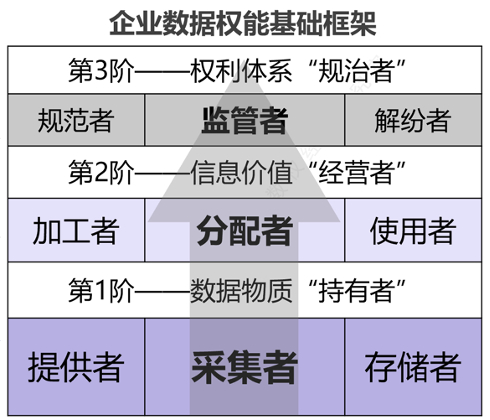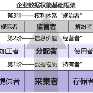 主要角色包括:一阶数据的提供者、采集者、存储者,统称为数据物质“持有者”;二阶信息的加工者、分配者、使用者,统称为信息价值“经营者”;三阶治理的规范者、监管者、解纷者,统称为数据权利“规治者”。企业数据权能基础架构,按三个层级自下而上构建,每个基础权能相对独立又相互关联,低阶权能是高阶权能实现的基础,高阶权能是低阶权能的约束。其中一阶采集者、二阶分配者、三阶监管者,是数据权能配置决策的核心角色,纵向构成了企业数据权能体系的支柱。