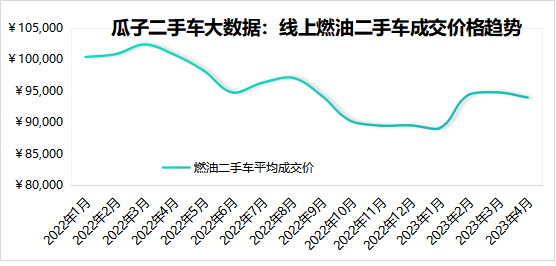 趋势一:降价潮下,线上燃油二手车成交价4月环比微降800元,比近1年低点高5千元