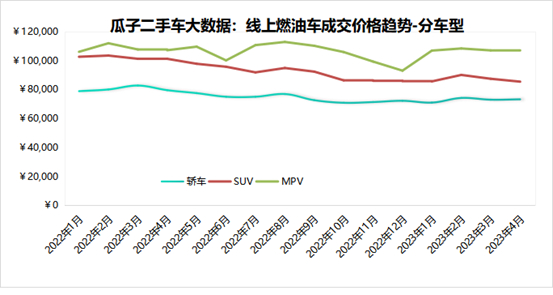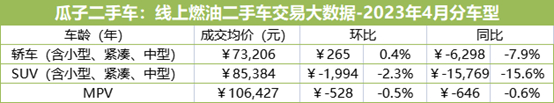 趋势二:次新车受降价潮影响最大,4月成交价环比跌9000元,创近1年新低