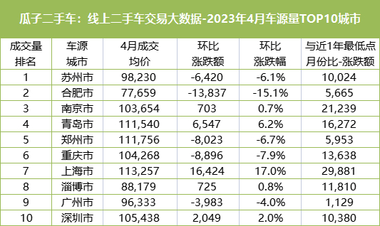 第三方平台瓜子二手车大数据显示,截至目前,按车源所在城市看,前10大车源成交城市依次为苏州、合肥、南京、青岛、郑州、重庆、上海、淄博、广州以及深圳等城市。其中4月份环比降幅最大的是合肥市,成交价从7.77万降低了1.38万元,环比降幅超过15.1%,降价幅度大于武汉4月份的环比降价约8600多元。而4月份环比涨价幅度最大的则是上海市,4月成交价11.3万元,环比增1.64万元,环比涨幅为17%。分析显示,广州、合肥、郑州、武汉等城市不仅4月份车源降价空间已经基本释放,接近全年新低,建议拟购入上述城市车源的二手车可以及时入手。需要注意的是购买二手车不能只看价格,更要关注保障好不好。依然建议从瓜子等能够提供车况真实保障、交易保障及售后保障的平台进行比价选购,既可以避免后续大幅反弹、也可以规避因为车况问题带来的额外损失。