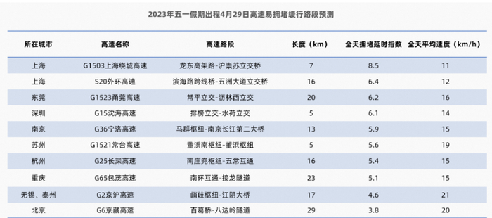 IT之家从报告中获取到,高德预计 2023 年 4 月 29 日(五一假期首日)全国高速出程较易拥堵的路段主要是 G1503 上海绕城高速(龙东高架路-沪崇苏立交桥),全天拥堵延时指数约为 8.5,全天平均速度约为 11km / h,其次是上海 S20 外环高速(滨海路跨线桥-五洲大道立交桥)以及 G1523 甬莞高速(常平立交-沥林西立交),预计拥堵高速主要分布在长三角、珠三角、成渝地区,以及北京、郑州、西安、昆明、长沙、武汉等城市周边。