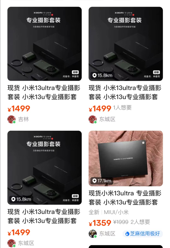 目前,在二手交易平台上,小米13 Ultra摄像套装的价格普遍被加价到了1500元左右。而这款产品的官方指导价格为999元,首销价格更是只有799元,这些黄牛是直接加价了接近一倍左右。此情此景,和数年前小米数字系列旗舰手机开售时有点类似。