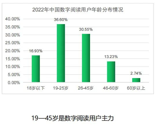 在用户年龄方面,19~45岁的人群是数字阅读的主力军,占比达67.15%。数字阅读不断向银发族和青少年延伸。60岁以上群体占数字阅读用户比例为2.74%,较上年增长超一倍,成为亮点之一。《报告》显示,在数字阅读用户群体中,人均电子阅读量为11.88本(部),有声阅读量为7.44本(部)。