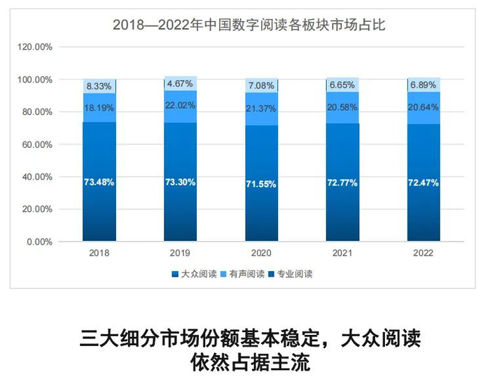 《报告》显示,2022年我国数字阅读市场总体营收规模达463.52亿元,同比增长11.50%。按三大细分板块看,大众阅读市场营收335.91亿元,占比72.47%;有声阅读市场营收95.68亿元,占比20.64%;专业阅读市场营收31.93亿元,占比6.89%。大众阅读依然占据市场主流。