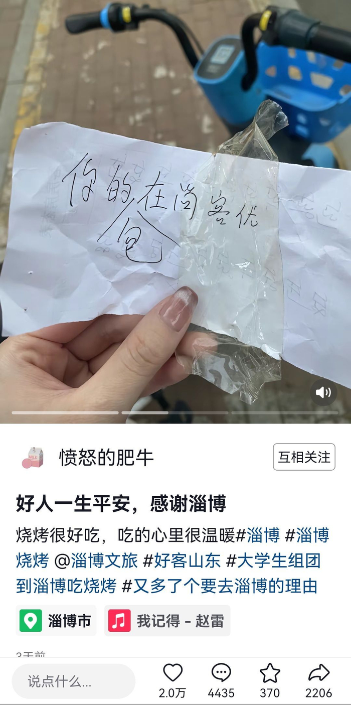 游客到淄博烧烤丢包找回一事“出圈”各大媒体热搜平台,“你的包在尚客优”字条的背后,就是淄博有备而来的代表与缩影。