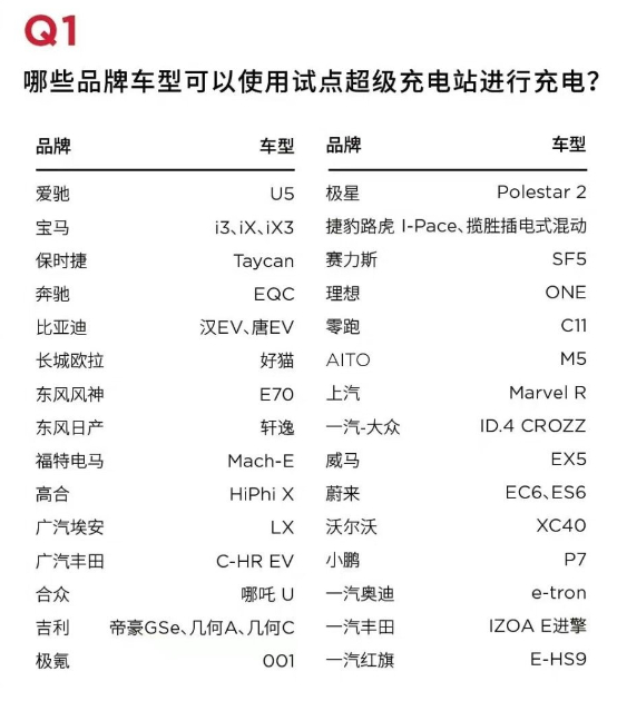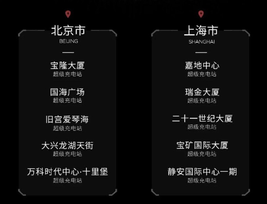 根据特斯拉官方公布,特斯拉首批开放试点的10座超级充电站分布在北京和上海的商务办公区、购物中心等新能源车主聚集区,包括比亚迪、蔚来、小鹏在内的15个品牌37个车型均可以使用特斯拉试点超级充电站进行充电。