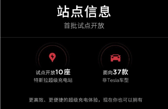 在首批试点开放的充电站主要面向37款非特斯拉车型,北京、上海两地将一共开放10座超级充电站,同时在北京、上海、广东、江苏等25个省市开放120座目的地充电站。