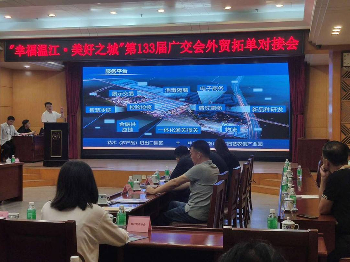4月24日,成都市温江区组织区内部分生物医药、花卉进出口、进出口贸易等领域企业赴粤开展133届广交会外贸拓单对接会。对接会聚焦“幸福温江、美好之城”奋斗目标,充分利用广交会线下平台积极发挥互补效应,挖掘互补优势,通过搭建“买全球、卖全球”服务平台,为温江区企业提供共同探讨全球市场的发展趋势和合作机会,促进区内企业与广州市场的深度合作,提升区域经济发展能力,推进成都市温江区打造“国际国内双循环”贸易集散高地。