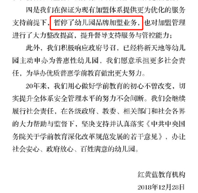 2018年虐童案一审宣判,红黄蓝官方微博曾宣布暂停幼儿园品牌加盟业务,优化提升对现有加盟商服务支持与管理。但似乎未见成效。2019年7月黑外教猥亵儿童事件,2021年4月“闻脚”事件,这一系列安全问题仍然偶有发生。
