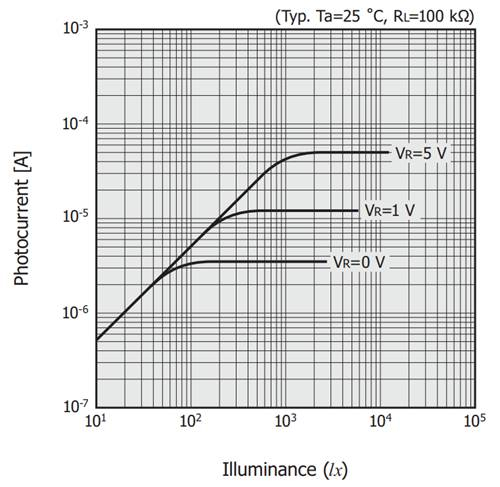 Hamamatsu 是的光电探测器制造商。该图摘自他们的硅光电二极管手册,让您了解通过增加反向偏置电压可以将光电二极管的线性响应区域扩展多少。