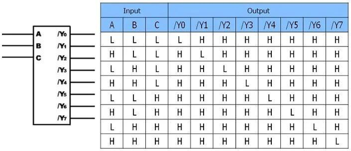 解码器也是一种典型的组合逻辑电路,我们以VHC138为例进行逻辑解读。解码器将N个编码输入的二进制信息转换为最多2N个独特输出。它通常用于增加端口数量和生成芯片选择信号。图6显示了3对8解码器(即具有三个输入和八个输出的解码器)的逻辑符号、真值表和时序图。