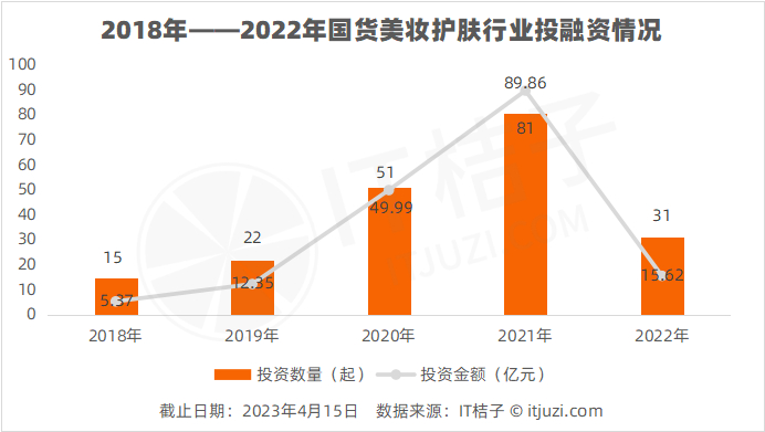 IT 桔子数据显示,2018 年以来国货美妆护肤赛道迎来众多投资方入局。投融资交易数量由十几起事件,飙升至 2021 年的 81 起;投融资交易额由 2018 年的 5.37 亿元飙升至 2021 年的近 90 亿元。