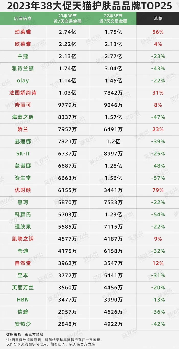聚美丽数据显示,2023 年 3.8 大促各大护肤品牌表现并不理想。以线上市场份额最大的天猫平台为例,护肤品牌交易额 TOP 25 排名中,仅有 8 家品牌销量较去年同期出现涨幅,其余 17 家品牌均出现下跌。从销售额来看,TOP 25 品牌 3.8 期间累计销售额为 21.61 亿元,而在去年同期排名前 25 的品牌销售额为 26.76 亿元,整体下滑 19.24%。