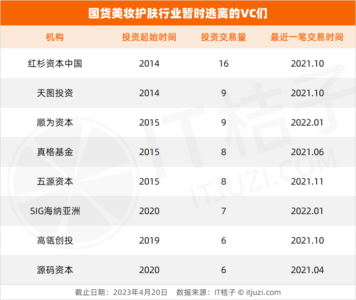 红杉资本中国和天图投资均自 2014 年起出手投资国货美妆护肤行业,两者至今投资交易量为 25 起,不过最近一笔投融资交易均停留在了 2021 年 10 月;顺为资本 2014 年开始投资,2022 年 1 月参与投资完护肤品品牌 C 咖之后,再未有投资出手。另外,此前长期支持国货品牌的真格基金、高瓴创投、源码资本等一批 VC,公开数据显示,各位对国产美妆品牌的投资也暂停在了 2021 年。