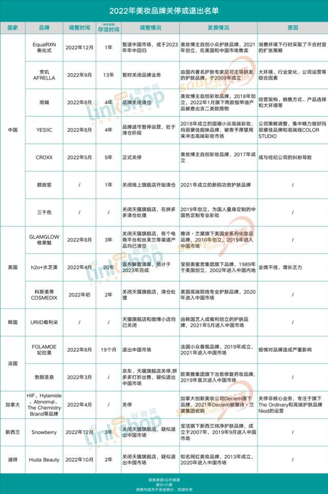 除国货品牌之外,另有一批国外品牌也宣告撤退中国市场,火热的行业迎来寒冬。