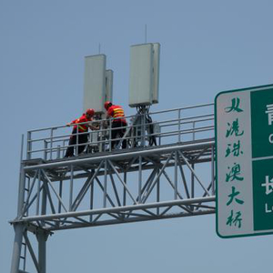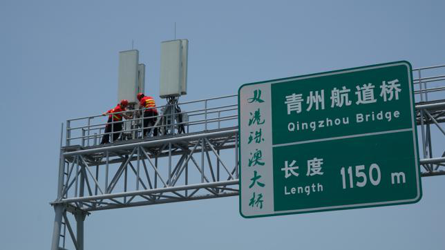 中国铁塔技术人员在港珠澳大桥龙门架上检测维护基站通信设备