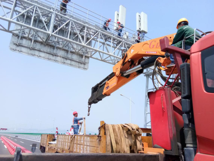 施工人员在港珠澳大桥龙门架上安装公网通信基站天线