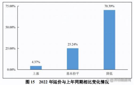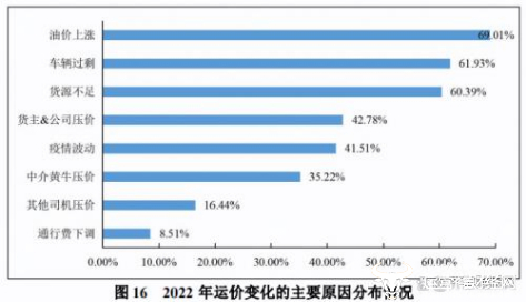 《报告》中提到,运价变化的主要原因:一是油价上涨成为最大成本推手。69.01%的货车司机反映2022年造成运价变化的主要原因为油价上涨。油价上涨而运价没有相应上涨乃至下跌,司机收益受到严重影响。2022年平均油价上涨幅度约3成,如果按照燃油成本占物流企业运输总成本30%计算,总运输成本上涨了约10%。由于大部分企业签订运输合同没有涉及油价联动条款,在供过于求的市场环境下运输企业、个体司机缺乏议价权。二是车辆过剩加剧市场低价竞争,61.93%的货运司机反映2022年运价变化的主要原因为车辆过剩。三是货源不足拉低整体价格。60.39%的货车司机反映运价变化的主要原因是货源不足。以上三个原因是运价变化最主要的原因。此外,40%左右的货车司机反映存在货主、企业和中介压价问题,但是根本原因仍然是市场供过于求导致价格下降。