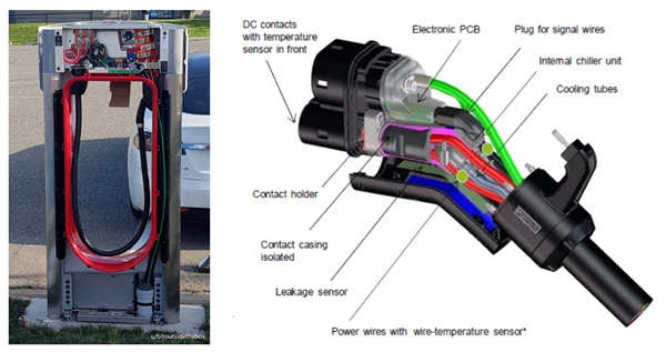而为了不让充电桩充着充着就烧起来,即必须给它设计散热系统。比如特斯拉的桩,就使用了风扇 + 液冷散热。虽然降温的效果不错,但成本也是实打实的增加了。