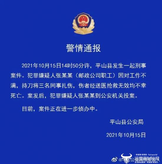 根据当时的媒体报道,2021年10月15日,河北发生一起刑事案件。张某某(邮政公司员工)因对工作不满,持刀将三名同事扎伤,伤者经送医院抢救无效均不幸死亡。这在网上被称为”10·15平山杀人案”。