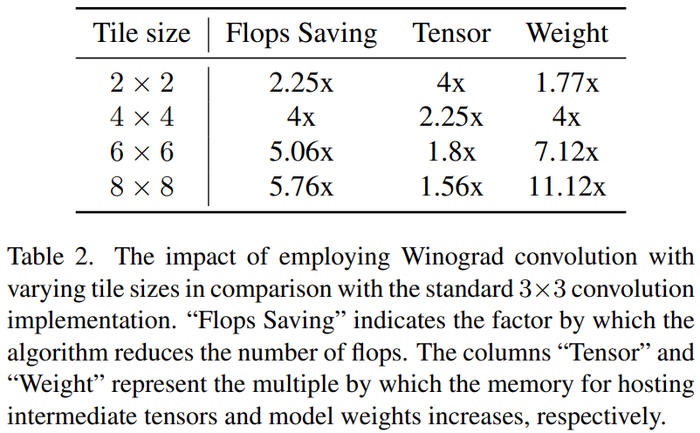 Winograd 卷积将卷积运算转换为一系列矩阵乘法。这种方法可以减少许多乘法运算,提高计算效率。但是,这样一来也会增加内存消耗和数字错误,特别是在使用较大的 tile 时。