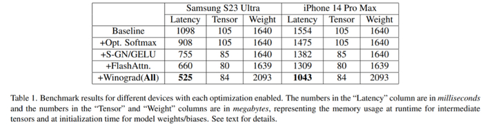 该研究在各种设备上进行了基准测试:三星 S23 Ultra(Adreno 740)和 iPhone 14 Pro Max(A16)。基准测试结果如下表 1 所示: