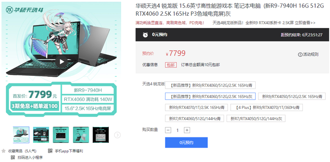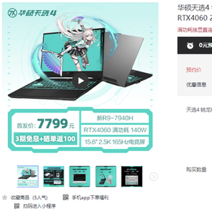 首发搭载4nm锐龙9 7940H处理器!RTX4060版华硕天选4游戏本7799元起