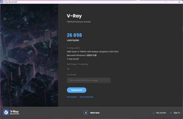 第三款软件是V-Ray,测试版本为5.0.20,最终成绩为26898,同样比较给力。对比官方数据库,该成绩同样超过了不少桌面处理器,而且不乏旗舰型号。