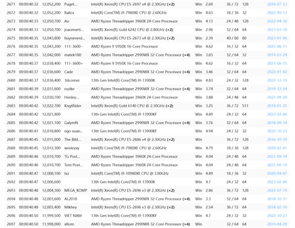 第二款测试软件是Corona,版本为1.3,完成测试的时间是40秒,Rays/sec达到了12041700,参考官方数据库,这个成绩同样非常夸张,直接与AMD上一代桌面处理器的旗舰型号打平。两者在核心规格方面一致,但凭借ZEN4架构,即使功耗更低,但实际效率相差不大。
