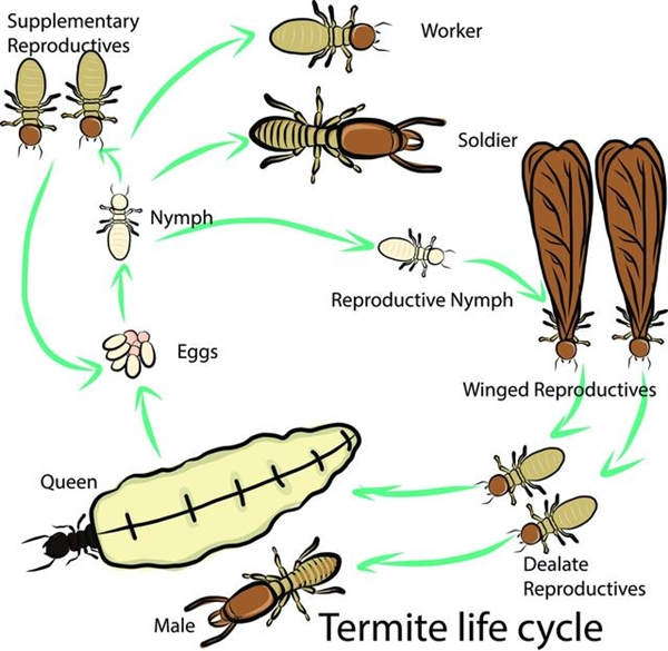 若虫可以发育成2种繁殖者,有翅和无翅。有翅膀的就是要飞出去婚飞自己建立巢穴的,无翅膀的,则可以在不经过婚飞阶段的情况下成为繁殖型白蚁,直接待在巢穴中以备后用。