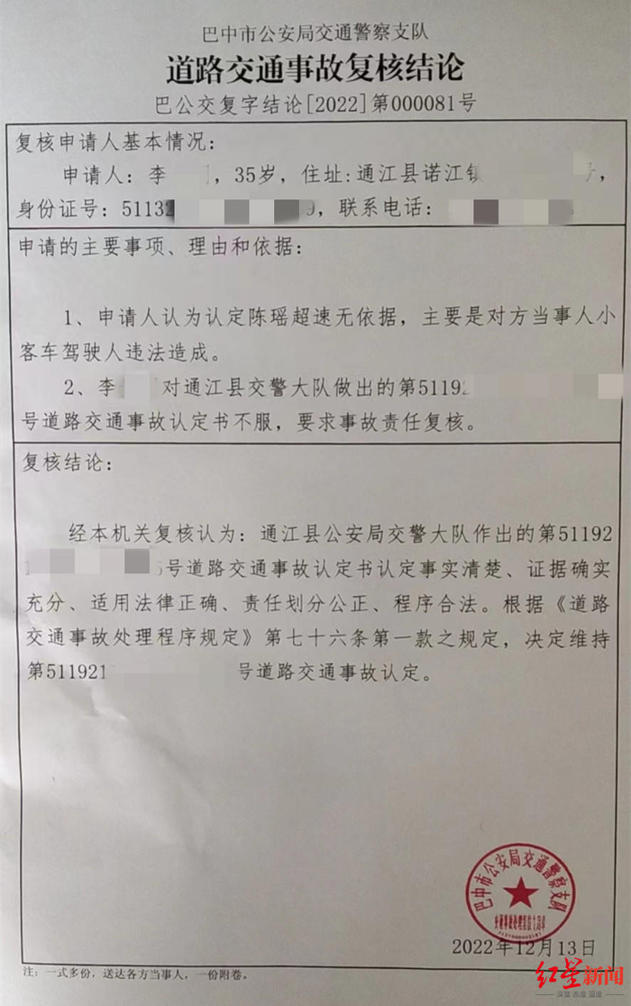 李先生认为,事故认定对死去的妻子“不公”,向巴中市公安局交警支队申请复核,后者复核后维持原认定。