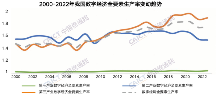 报告指出,我国数字经济全要素生产率进一步提升。从整体看,2022年,我国数字经济全要素生产率为1.75,相较2012年提升了0.09,数字经济生产率水平和同比增幅都显著高于整体国民经济生产效率,对国民经济生产效率提升起到支撑、拉动作用。分产业看,第一产业数字经济全要素生产率小幅上升,第二产业数字经济全要素生产率十年间整体呈现先升后降态势,第三产业数字经济全要素生产率大幅提升,成为驱动数字经济全要素生产率增长的关键力量。