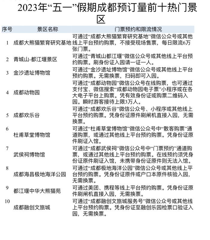 “五一”小长假即将开始,你的出游目的地确定了吗?据在线OTA交易平台预订大数据显示,成都大熊猫繁育研究基地、青城山-都江堰景区、金沙遗址博物馆、成都动物园、成都欢乐谷、杜甫草堂博物馆、武侯祠博物馆、成都海昌极地海洋公园、都江堰中华大熊猫苑、成都融创文旅城等景区备受游客青睐,预订量较高、排名靠前,预计假期客流量较大。为此,成都市文广旅局发出提示,市民游客如果打算前往以上景区,应提前了解景区预约购票、入园须知和周边交通管理等相关信息,提前通过景区官方微信公众号或其他线上交易平台预约景区门票。