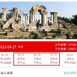北京网友订票时发现,圆明园遗址公园线上门票预订页面显示,4月29日至5月1日,成人票和未成年票余票均显示为零。据说这是圆明园门票史上第一次全部售罄。而工作人员也确认,以前确实没有出现门票售空的情况。虽然现场售票窗口还可以买纸质票,可看这个架势,到时候游客绝对不会少。