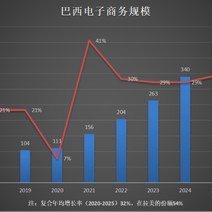 根据美洲市场情报(AMI)资料,巴西电商市场规模快速增长,从2020年至2025年的复合年均增长率高达32%,在整个拉美的份额占比约为54%
