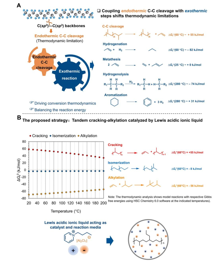 聚合物 C-C 键的裂解是吸热的,故会在低温下受到热力学的限制。为了在低温下实现更高的转化率,吸热的 C-C 裂解必须与放热反应进行动力学耦合。