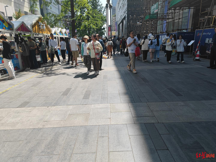 4月29日15点多,红星新闻记者来到红星路三段,从热门打卡点——IFS“爬墙大熊猫”,一路走到美食一条街的春熙路,“五一”小长假的“威力”可见一斑,拍照打卡、品尝特色美食的游客众多。天气较热,奶茶冰水必不可少,但是红星新闻记者一路走来,都没有看到随意丢弃的塑料垃圾、食品包装等,同时可供游客休息歇脚的路边座椅旁也十分干净。
