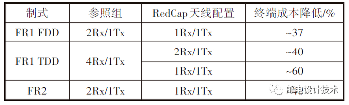 终端射频通道是终端成本的重要组成部分。减少RedCap终端的天线数可降低终端射频收发机和基带处理模块的要求,直接降低成本。值得一提的是,随着天线数的减少,RedCap终端可支持的MIMO层数也相应减少,即对于接收天线数为1Rx的RedCap终端,其支持的最大DL MIMO层数为1。对于接收天线数为2Rx的RedCap终端,其支持的最大DL MIMO层数为2。3GPP评估了由于天线数降低以及MIMO层数降低带来的终端成本降低[4],如表2所示。
