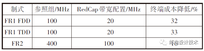 对于R15/R16版本的5G终端,FR1频段支持的最大信道为100 MHz,FR2可支持的最大信道带宽为400MHz。对于Rel-17 RedCap终端,FR1频段支持的最大信道带宽减小为20 MHz,FR2可支持的最大信道带宽减小为100 MHz,终端成本降低估算如表1所示。