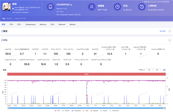 咱们直接一波须弥开跑, 20 分钟跑下来,平均帧率可以保持在 59.6 帧。
