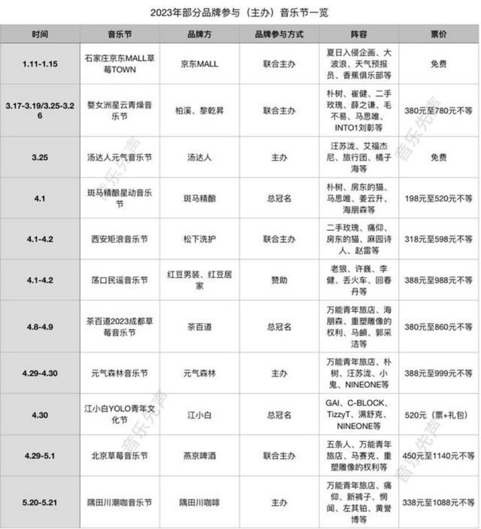 其实主要还是音乐节带来的想象力太大了,几万人来到一个地方,主打“享受”。比如科切拉音乐节。1999年,举办第一届时,科切拉的门票价格仅为50美元。到了2022年,449美元只能买一张最便宜的入场门票,而想进入VIP区域,最少要花费929美元,最高级别的VIP门票已经高达1119美元。当然除了票价外,参加音乐节的机票、酒店住宿、班车、食物以及饮品等也藏着一笔大生意。2019年,科切拉音乐节营收为8.05亿美元,约等于54亿人民币。更夸张的是,这个科切拉为期只有三天。科切拉音乐节还凭一己之力直接拉动了举办地的经济发展。Indio市在科切拉音乐节举办期间获得了2.12亿美元的经济收入。大量的人聚到一起,就会产生巨大的价值。在国内,音乐节背后的主办方,不单单只是演出商迷笛、摩登天空这类专业机构,也有景区、房地产商、企业乃至政府。很多人会发现,现在地方性音乐节越来越多,而各路品牌也开始陆续入局音乐节。地方性音乐节2016年,广州锐丰文化帮助都江堰打造了第一届西部音乐节,在“十一”期间投入7000万元成本,连续5天入园游客超10万人。活动结束后,都江堰政府算过一笔经济账,音乐节5天吸引了超过50万人,按照人均来计算,包含所有的吃住行,每人玩一天平均消费500元,每天10万人消费就为当地餐饮、酒店等带来5000万元收入,5天就是2.5亿元。虽说并非直接依靠音乐节本身盈利,但通过音乐节拉动其他相关产业间接实现盈利。据华西都市报和都江堰政府发布的数据显示,当地2016年环比提升了18%的客流量,增加了1.8%GDP还有贵州遵义赤水在2017年举办赤水河谷音乐节,请来崔健、朴树、谢天笑等30组音乐人,赤水在国庆长假迎来187万人次游客,同比增长35%。还有最近频频出圈引发热议的淄博,除了烧烤,还有音乐节。因音乐节出圈的小众城市比比皆是。品牌方热衷音乐节音乐节势头越来越猛,品牌方对于演出市场的“野心”早已从拉高声量的赞助、冠名,逐渐过渡到尝试自主打造音乐节IP,光是五一前后办音乐节的品牌就有元气森林、隅田川咖啡、蜜雪冰城和江小白。在票务平台上,每场音乐节都有上万人关注。为何?其最根本的目的还是在于品牌营销,即更进一步打入年轻消费主力,扩大消费圈层,以此提高市场占有率。